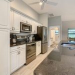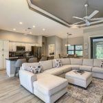 Enjoy a spacious lanai, high ceilings, tile, porcelain flooring, and luxury finishes. Beyond the entryway, the home flows into a luminous, open-concept living, dining, and kitchen area. The kitchen is every home cook’s dream. It features marble countertops, stainless steel appliances, a gray tile backsplash, and modern fixtures. Create beautiful memories with your family gathered around the beautiful, oversized kitchen island, and entertain your guests while making delicious meals. The master bedroom is an owner’s retreat featuring a walk-in closet, standing shower, dual vanities, and lanai access. The split floor plan conveniently provides privacy when your friends and family come to visit.